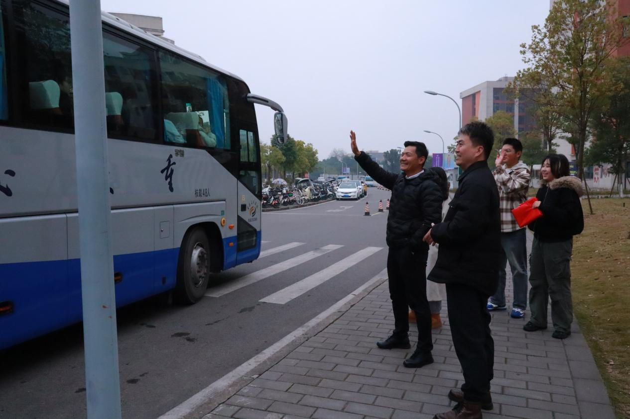 考生登车前,刘振副书记和老师们组织考研学子集体喊出加油口号,“一研成硕”,整齐有力的声音回荡在现场,瞬间点燃了冬日清晨的寒意,也镌刻下拼搏征程中最温暖的一幕。车轮启动前,刘振副书记跟随上车,再次叮嘱注意事项,检查证件和考试用品是否带齐,调整呼吸、保持节奏,把三年来的积累从容展现出来。