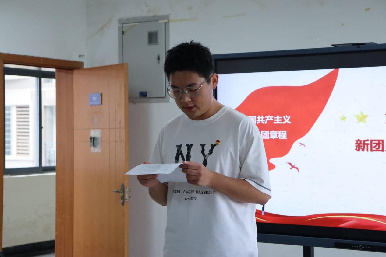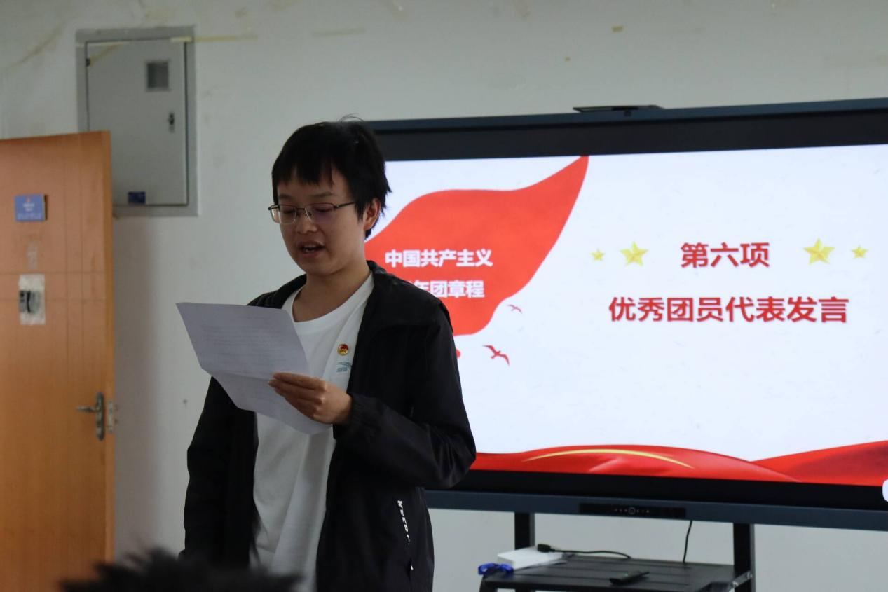 随后,优秀团员代表叶丰宁发言。他代表老团员向新团员表示祝贺,并分享了自己入团时的感受。他提出,团员应在思想上坚定信念,学习上勤奋刻苦,行动上勇于担当。同时,他鼓励新团员严格要求自己,并表示老团员将以身作则,与新团员携手共进。