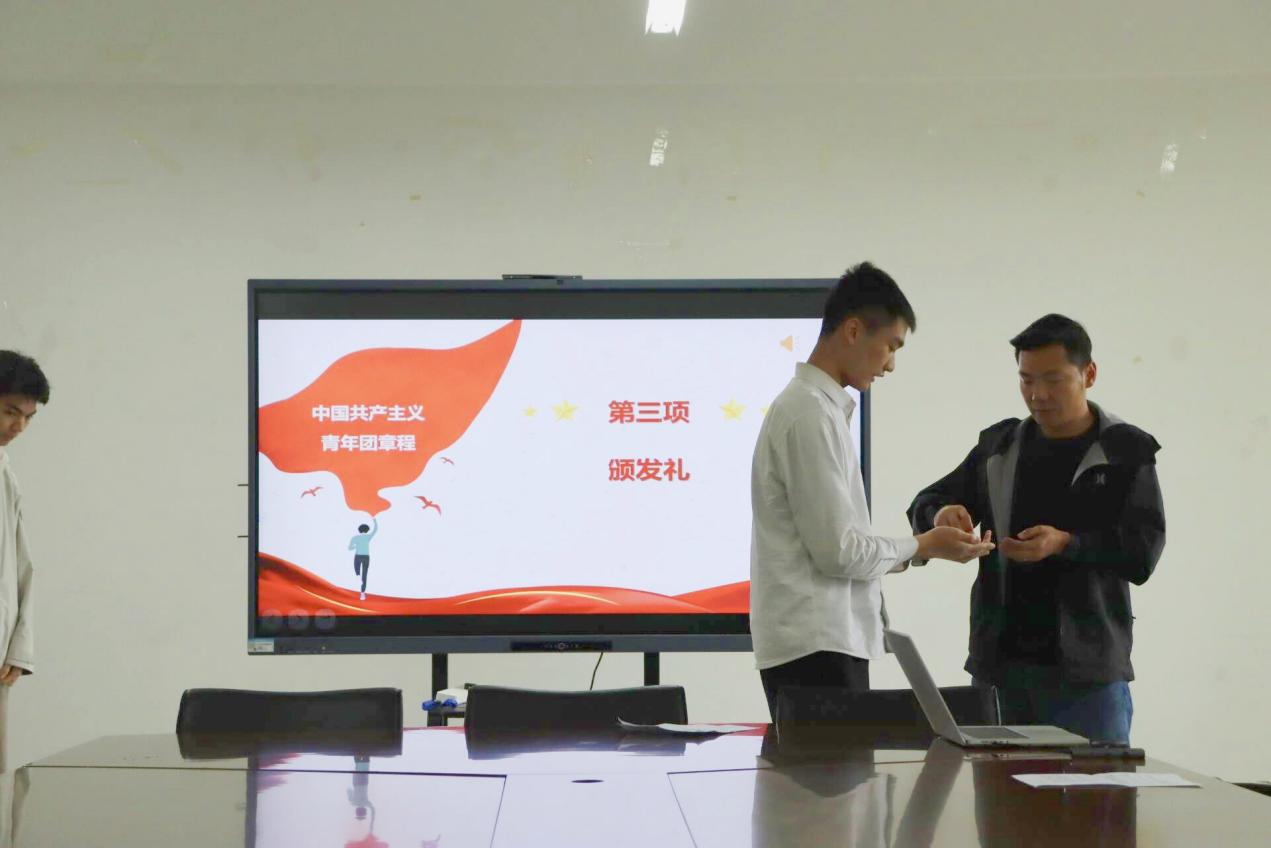 仪式在庄严的国歌声中拉开帷幕。随后,团委副书记李河星老师宣读了新团员名单,新团员依次进行自我介绍。随后,刘振副书记和李河星老师为新团员逐一颁发团徽,并与大家合影留念。