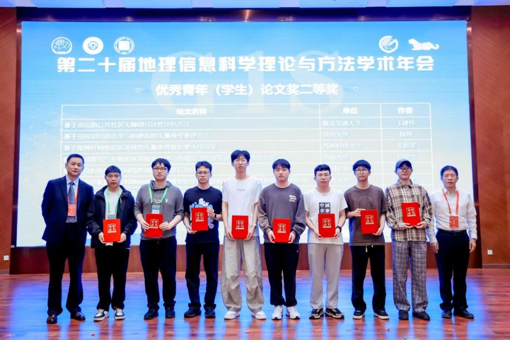 青年学者(学生)论文竞赛报告上,重庆交通大学智慧城市学院的学子们积极参与。丁健伟同学展示了《基于点云的公共社区无障碍可达性评估方法》,将先进的激光雷达技术应用于社会服务领域,并荣获大会优秀青年论文奖二等奖。彭锦鸿同学分享了《基于LLM的森林点云三维场景图表达及应用》,探索了大语言模型在森林点云数据处理中的创新应用。陈明阳同学汇报了《基于卫星影像的高压输电线路三维重建》,提出了输电线路三维重建的新思路。朱康瑞同学展示了《基于自监督场景坐标回归与3D高斯的室内三维模型变化检测方法》,实现了对室内场景动态变化的高精度、高效率识别。