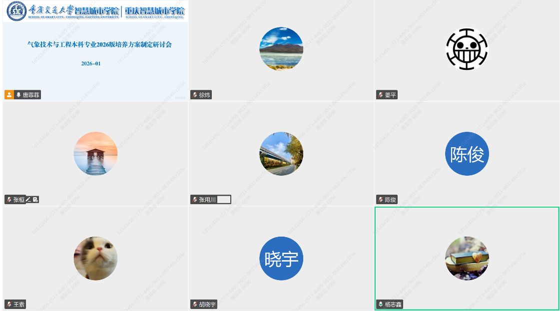 为积极响应国家加快发展新质生产力、壮大低空经济的战略部署,主动应对智慧城市精细化治理与城市安全运行对气象前沿技术的迫切需求,智慧城市学院于2026年1月21日上午组织召开气象技术与工程本科专业建设线上专题研讨会,重点研讨“气象技术与工程”本科专业2026版培养方案制定工作安排。会议由智慧城市学院副院长唐菲菲教授主持,智慧城市学院、河海学院相关教师以及气象领域相关青年学者参加研讨。