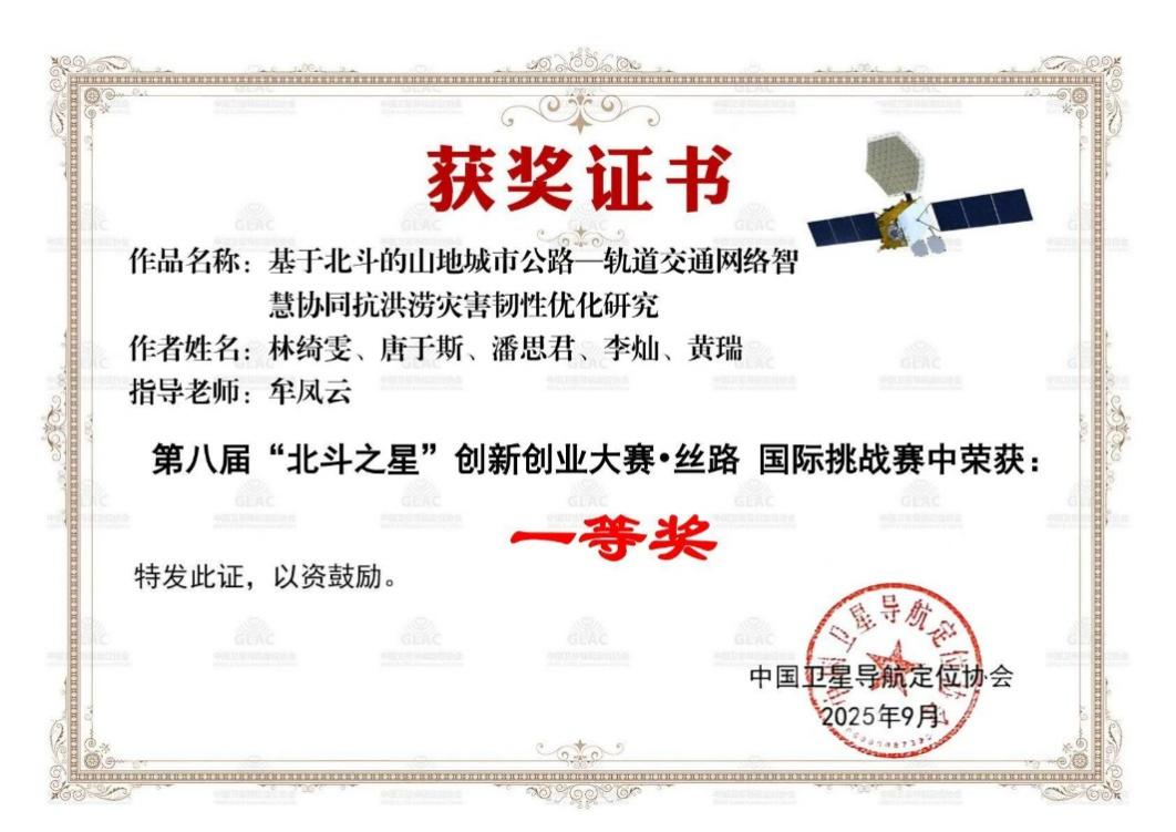 智慧城市学院牟凤云教授指导,由2023级地理空间信息工程专业林绮雯、唐于斯、潘思君、李灿和黄瑞等五名同学组成的本科生团队,完成了题为《基于北斗的山地城市公路-轨道交通网络智慧协同抗洪涝灾害韧性优化研究》的参赛作品。经中国卫星导航定位协会专家委员会严格评审,在第八届“北斗之星”创新创业大赛•丝路国际挑战赛赛道成功斩获大赛一等奖,牟凤云教授同步荣获“北斗名师”称号。